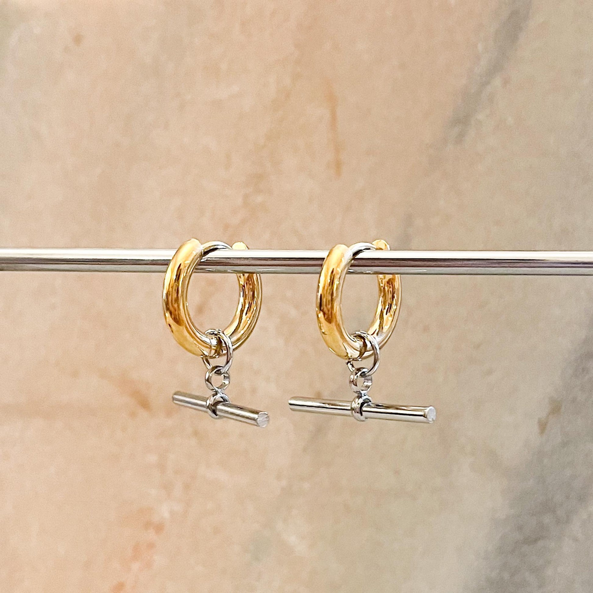 Elevate your everyday look with these modern T-Bar Toggle Hoops. Blending minimalist geometric shapes with a high-polish finish, these earrings offer a unique twist on the classic huggie hoop. The sleek horizontal bar dangles freely, catching the light and adding movement to your jewelry stack.